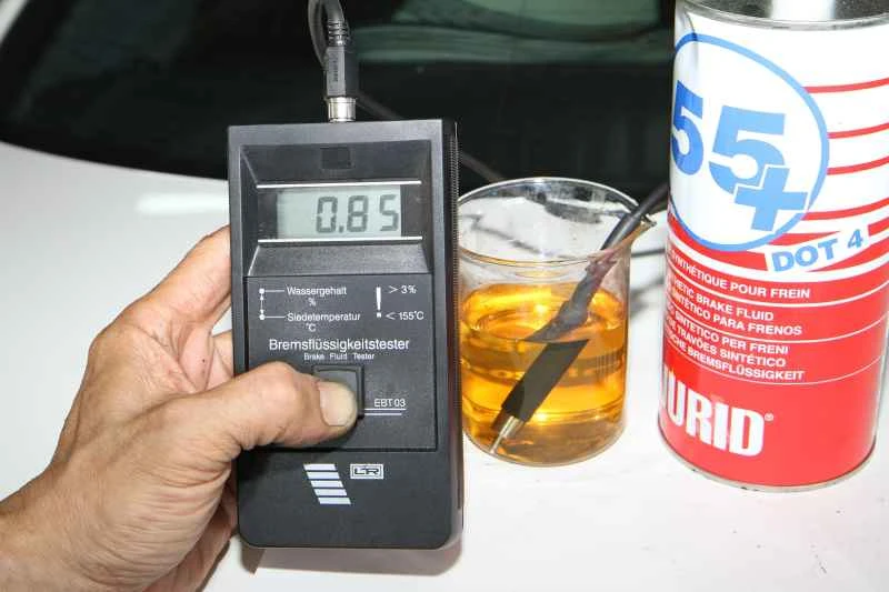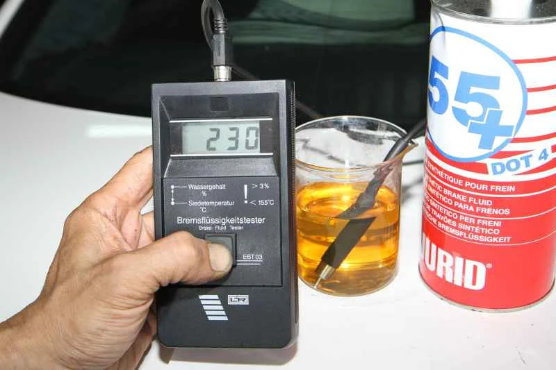 新品のブレーキフルードの水分含有量を測定したところ、0.85%、湿潤沸点は230℃でした。新品のフルードは黄色がかっていましたが、非常に透明でした。検査方法としては、専用の湿潤沸点試験器を使用するのが最適です。機器のプローブをブレーキフルードに浸すと、画面にブレーキフルードの現在の水分含有量と湿潤沸点が表示されます。安全な値は、水分含有量が2%未満、湿潤沸点が170度以上です。これらの値を超える場合は、ブレーキフルードを新しいオイルに交換することをお勧めします。