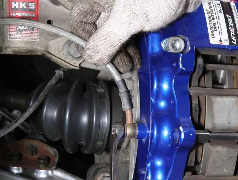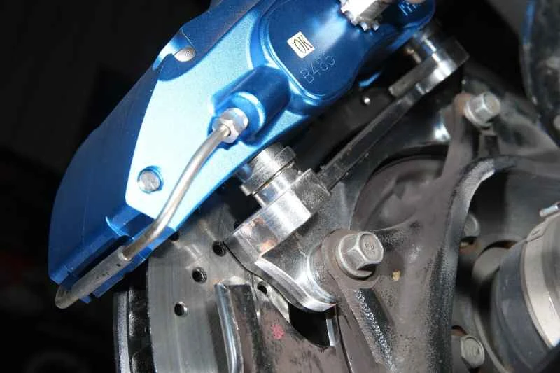 マルチピストンキャリパーシステムを導入する際には、ブレーキラインも元のゴム素材から金属コーティングされた素材に交換されることがよくあります。なぜでしょうか?それは、ブレーキのレスポンスを向上させるためです。しかし、金属ホースは純正ゴムホースに比べて柔軟性と順応性が低いため、設置作業中は金属ホースが自然な向きに保たれるように技術者が確認する必要があります。ホースを張ったり回転させたりしないでください。弾力性が失われ、硬くなってしまうからです。常に動いているショックアブソーバーの近くに設置すると、ホースのテフロン層が簡単に割れてオイル漏れが発生し、悲惨な結果を招く可能性があります。さらに、摩擦による損傷や漏れを防ぐため、固定には専用のブラケットを使用することをお勧めします。
