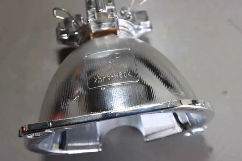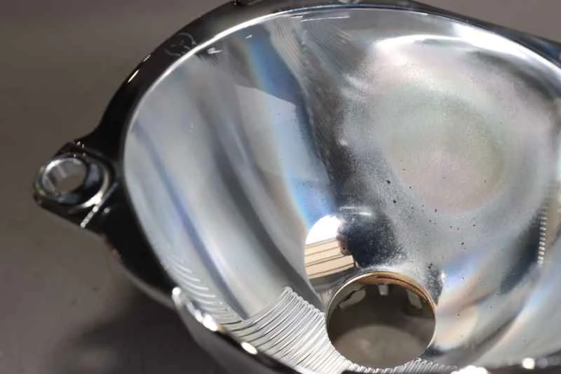 リフレクターカップの電気メッキ層が曇る原因は、純正魚眼ランプのリフレクターカップが主に放熱性の悪いプラスチック素材で作られていることです。タングステンフィラメント電球やHID電球による長年の高温照射により、リフレクターカップ上部の内縁にある電気メッキ層が過熱し、曇り始めます。