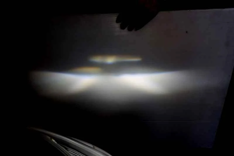 シンプルな白いプラスチックシートを使って光のパターンを確認すると、左右は十分に明るいものの、下部は車の正面にあたる広い暗い領域が広がっていることがわかります。夜間、特に雨の日には明るさが足りないのも無理はありません。修理を手伝ってくれた店主のヤン・ジョンジュンさんは、魚眼ヘッドライトは外側に突出した凸レンズがあり、魚の目に似ていることから「魚眼ヘッドライト」と呼ばれていると説明しました。凸レンズの後ろにはリフレクターカップがあり、電球から発せられた光を正しい方向と位置に反射します。凸レンズの光拡散原理により、ヘッドライトのビームは可能な限り遠く広く照らすことができます。純正の魚眼ヘッドライトのリフレクターカップは主にプラスチック製です。タングステンフィラメント電球やHID電球による長年の高温焼成により、リフレクターカップの上部内側縁の電気メッキ面が曇り始めます。この部分は車の前方に光を反射する役割を果たしており、曇ると車線の側面は非常に明るくなりますが、車前方の地面は十分に明るくなりません。