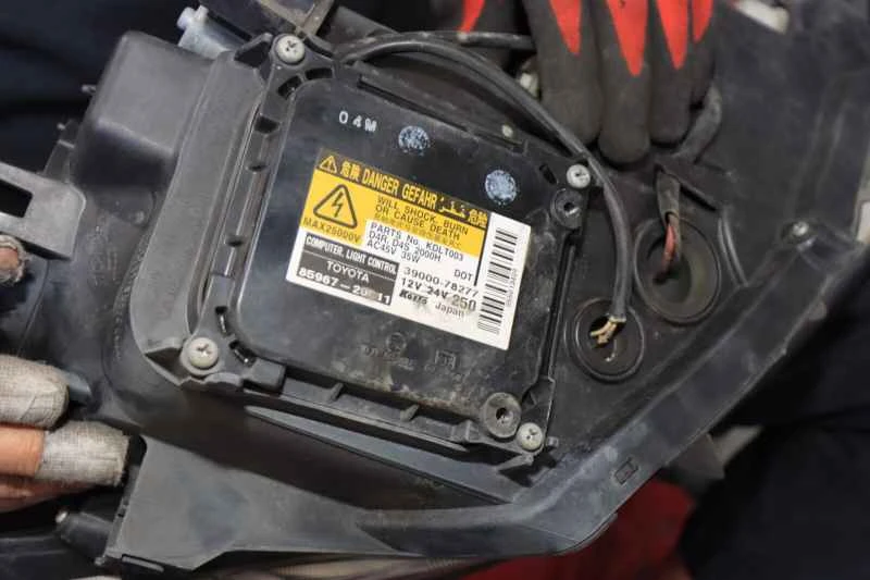 ヘッドライト下部に純正HIDバラストが見えます。このヘッドライトはHIDバルブを搭載しているにもかかわらず、夜間の明るさがまだ足りないので、原因を探り始めました。上記の 2 つの問題に加えて、ヘッドライト ハウジングの黄ばみや曇り、または HID バルブ/バラストの劣化も、ヘッドライトの明るさに影響を与える可能性があります。ヘッドライト ハウジングの黄ばみは、長時間日光にさらされたことが原因だと考えがちですが、そうではありません。根本的な原因は、油脂の蓄積です。運転中、車のフロント部、特にヘッドライト ハウジングの温度が低い部分には、他の車の排気ガスによる油脂や産業用ダストが蓄積することがよくあります。この油脂が徐々に蓄積し、ハウジングが黄ばんで明るさに影響を与えます。さらに、洗車時にヘッドライト ハウジングを溶剤ベースのクリーナーで洗浄したり、誤って磨いたりすると、表面の硬化層が損傷し、ざらざらした曇った仕上がりになり、ヘッドライトの明るさも低下します。