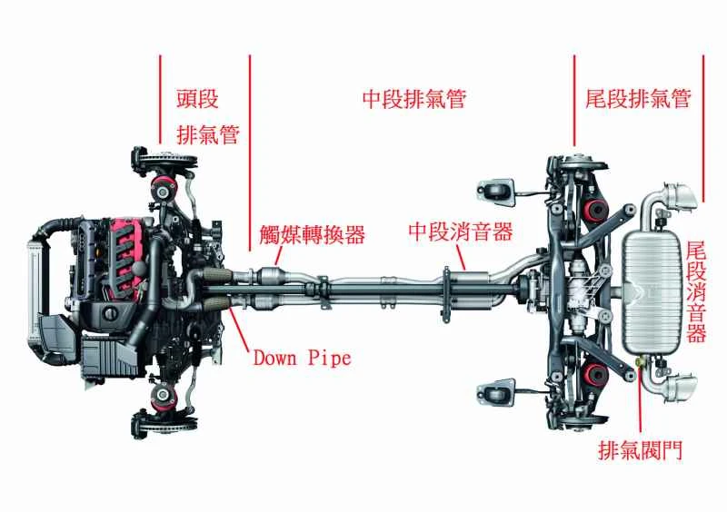 排気管各部の概略図。 エンジンの4ストロークサイクルの観点から見ると、排気ガスは一度に排出されるのではなく、波状に排出されます。それぞれのガス雲は非常に高密度で、前後のガス雲の間には真空圧(負圧状態)が生じます。前後のガス雲間の距離が適切であれば、負圧によって後続のガス雲が「引き離され」、排気口に向かって牽引力が生まれ、排気の流れがスムーズになり、エンジンは高いパワーを発揮します。前後のガス雲間の距離が離れすぎないようにするには、ガス雲の速度を制限する適度な排気抵抗が必要です。これにより、自然吸気エンジンは低中速域での運転が容易になり、より大きなトルクで車を走らせることができます。そのため、純正の排気管の背圧は非常に高くなっています。