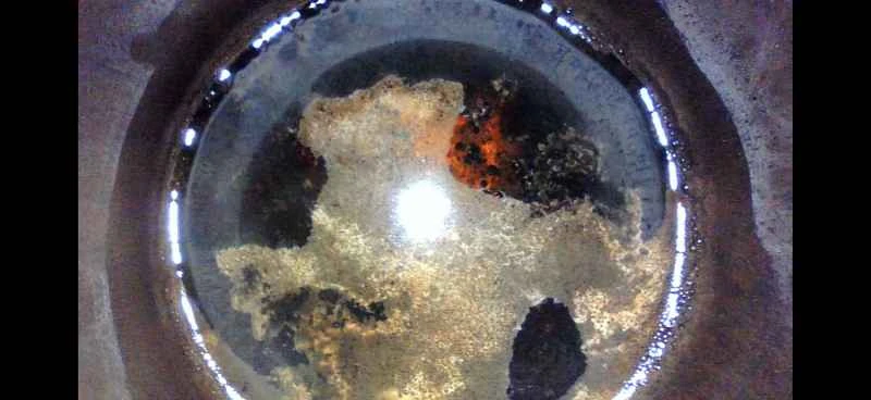 20分ほど待ち、燃焼室とピストン上部のカーボン堆積物が薬剤によって十分に軟化した後、真空吸引方式で薬剤とカーボン堆積物を一緒に吸い出します。黒い液体がパイプ内を流れ続ける様子に、不思議な満足感を覚えます。