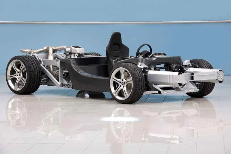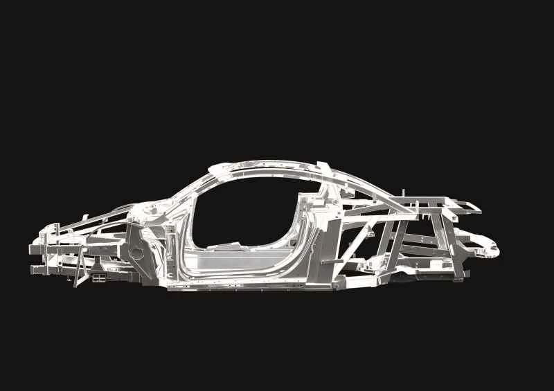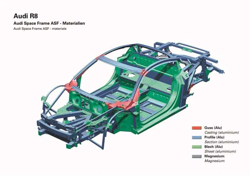 ボディ剛性の説明では、メーカーは通常、写真のボディ構造図を用いて説明しますが、正確なデータを提供しているケースは少ないです。この写真はアウディR8の設計図です。コックピットはケージ型のボディ構造で、車体前後はフレームで構成されていることがわかります。これは、車体の重量と剛性のバランスをうまく取っているようです。ここで読者は、サスペンションの完璧な機能がなぜ車体と関係するのか疑問に思うかもしれません。これは、車の完璧なハンドリングと高速安定性は、シャシーとサスペンションのセッティングに完全に依存しているからです。しかし、どんなに完璧なサスペンションシステムとシャシーアングル調整を施しても、ねじれや変形を起こしやすい車体に搭載すると、車体の過度な変形により、高速でアグレッシブなコーナリング時に効果的に機能しなくなり、結局は無駄になってしまいます。したがって、アグレッシブな走行時に車を運転しやすくするためには、車体の剛性強化が不可欠です。