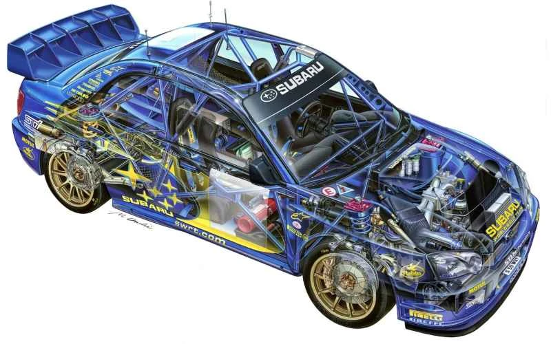 WRC公式ファクトリーカーにおいて、ロールケージなどのエンジニアリングによる車体剛性強化は、車両の耐衝撃性やねじれ強度を向上させるだけでなく、衝突時の車体の健全性を確保することも目的としています。これもまた、車体剛性強化の重要な目的の一つです。