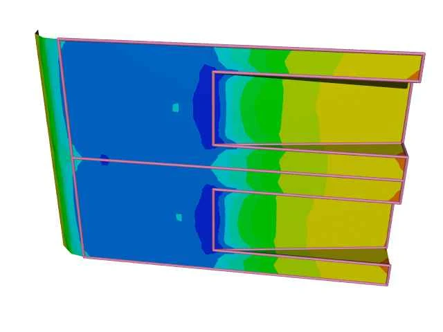 ディフューザーの主な役割は、車体下を通過する乱流を流線型の経路に導き、排出を加速することです。ディフューザーは排気ファンのように機能し、車体前方から空気を吸い込み、後方に引き戻します。車体後方から空気が急速に排出されるため、ルーフに対して真空状態のような低圧領域が形成されます。ルーフの圧力が高いため、高速走行時にはこの圧力によって車体が地面にしっかりと押し付けられます。図Aはリアディフューザーのガス圧分布を示しています。色が濃いほど圧力が低いことを示し、青は圧力が最も低い領域、赤は圧力が最も高い領域を表しています。図からわかるように、ディフューザーの前部(スロート)は気流速度が最も速く、圧力が最も低い部分であり、車体を効果的にコース上に「吸い込む」ように走行します。ディフューザーが膨張するにつれて、圧力と気流速度は徐々に正常に戻ります。
