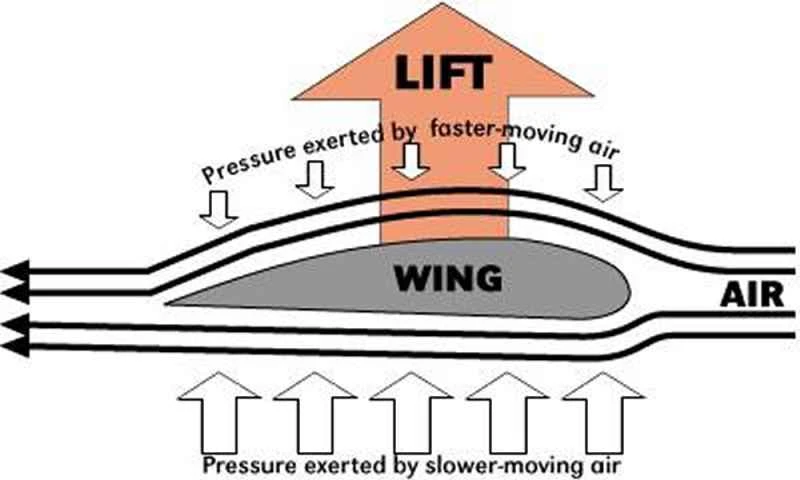 気流が翼上を通過する際、上面の気流が下面の気流よりも長い距離を移動する必要がある場合、上面の空気は下面の気流と同時に出会うために、より高速で移動する必要があります。ベルヌーイの定理によれば、速度が速いほど圧力は低くなります。そのため、上面の空気圧は下面の空気圧よりも低くなり、翼の上下面の間に圧力差が生じます。翼は実際には下面の高圧空気によって押し上げられ、揚力が発生します。これは、航空機の翼、車両の尾翼、および車体下部のディフューザーの応用における理論的根拠です。ただし、後者の2つは、単に上部と下部のウィングレットの長さが逆になっているだけです。