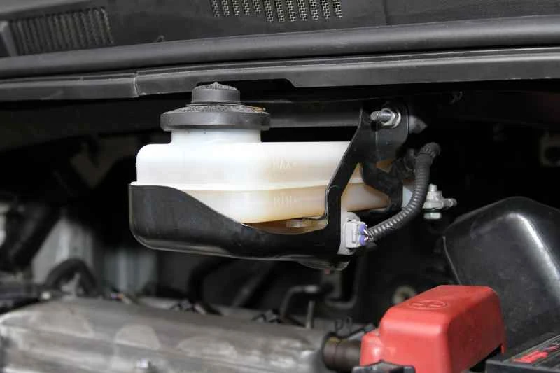 点検方法は、ファイアウォール付近のブレーキフルードリザーバーを開け、内部のブレーキフルードを観察することです。黒ずみや黄ばみがないか確認してください。もし黒ずみや黄ばみがある場合は、フルードが劣化しているため交換が必要です。そうでない場合は、20,000kmまたは1年ごとに交換する必要があります。さらに、フルードレベルの確認も重要です。フルードレベルがリザーバーの上限と下限の目盛りの間にあるかどうかを確認してください。低すぎる場合は、補充してください。元のブレーキフルードを補充するのが最善ですが、同じタイプのブレーキフルードが入手できない場合は、DOT 4ブレーキフルードで代用できます。