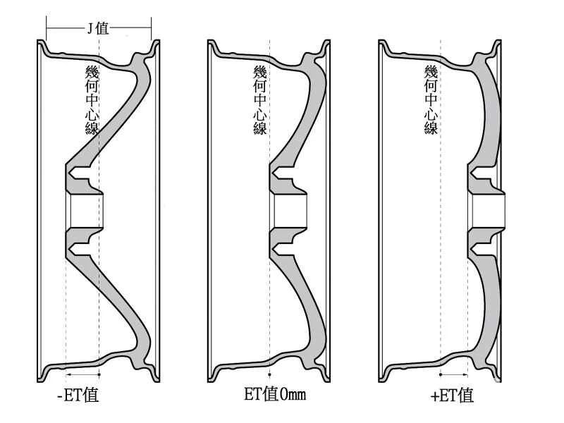 オフセット値(ET値)は、ハブの接合面からホイールリムの中心線までの距離を指し、単位はmmです。ほとんどの乗用車用ホイールリムのET値は35~42です。一部の特殊なアルミリムでは、タイヤの接地面積を最大化するために、ET値が0、あるいはマイナスになる場合があります。ただし、ET値が小さいほど車両の旋回半径が大きくなり、市街地でUターンをする際には何度も後退が必要になります。