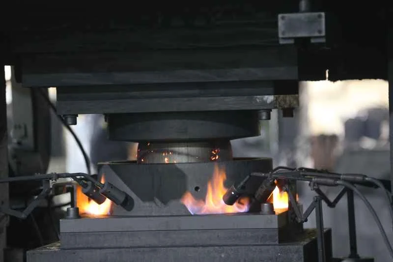 右側は鍛造前のアルミニウムインゴット、左側は鍛造機で押し出された後のホイールブランクです。固体のアルミニウム材は連続的にプレス加工されるため、成形後の内部構造と分子密度は非常に緻密で強固になります。鋳造ホイールには砂や気泡がほとんど存在せず、同じ体積や厚さであれば、鍛造材の機械的特性と強度は鋳造材よりもはるかに高くなります。一方、「鍛造」工程では、固体アルミニウムを加熱して軟化させ、鋼鉄製の金型に入れます。次に、アルミニウムは繰り返し非常に大きな力(約1万トン)で加圧・衝撃を受け、アルミニウムの表面を鋼鉄製の金型に予め保持された鍛造ビレットの形状に押し込みます。その後、CNC加工によってスポークが削り出されます。鍛造工程では固体アルミニウムが継続的に加圧されるため、成形後、内部構造と分子密度は非常に緻密で強固になります。鋳造ホイールに見られる砂や気泡は発生しません。そのため、同じ体積や厚さであれば、鍛造材の機械的特性と強度は鋳造材よりもはるかに高くなります。その結果、鍛造ホイールは、より薄いリムと薄いディスクで鋳造ホイールと同等の強度を実現し、大幅な軽量化を実現できます。同じサイズであれば、鍛造ホイールは約25~30%の軽量化が可能です。