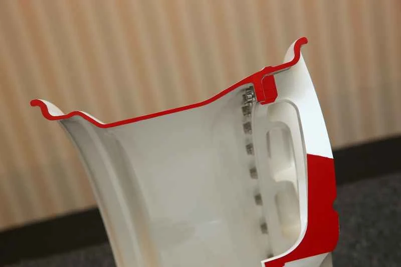 これは2ピース鍛造アルミリムの断面図です。リムが一体成形され、ディスクにネジで接続されていることがはっきりとわかります。これにより、深いリップ、広いET値調整範囲、優れた強度といった利点があり、リム漏れの心配もありません。 3ピースホイールはET値やJ値の調整が容易という利点がある一方で、実使用においては致命的な欠陥があります。衝突時にインナーリムとアウターリムの変位・変形によって隙間が生じ、タイヤの空気漏れにつながるのです。インナーリムとアウターリムはネジで固定し、接合部には空気漏れ防止のシーラントを塗布していますが、リムは地上で転がる部品であるため、路面からの振動や衝撃を受けます。経年劣化によりシーラントがリム表面から剥がれ落ちるのを防ぐのは困難です。この問題は、アウターリムとセンターディスクのみで構成される2ピースホイールでは発生しません。リムが一体成型されているため空気漏れがなく、ET調整の柔軟性とセンターディスクの容易な交換という利便性も兼ね備えています。