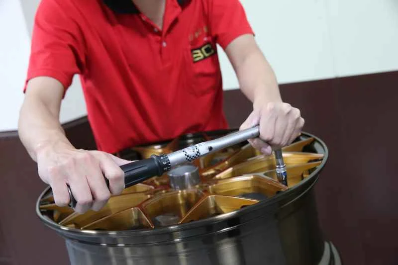 ツーピースホイールリムのすべてのネジが均一なトルクで締め付けられ、締め忘れがないように、ネジ締め作業はトルクレンチを用いて手作業で行われます。締め付け後、ネジには緩みがないか次回点検できるように印が付けられ、トルクレンチは定期的に校正されます。 【100の質問】鍛造・スピニング・鋳造の違いは?(後編)アルミホイール改造に必須のQ&A
