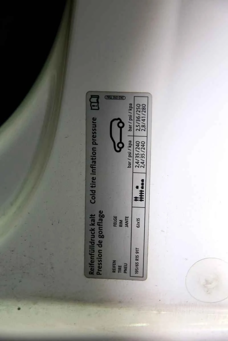車両の運転席側ドアシルの内側に、前輪と後輪の推奨冷間時タイヤ空気圧が表示されています。これは、ドライバーにタイヤ空気圧に注意するよう促すためのものです。タイヤ空気圧監視システムが装備されていない場合は、週に1回点検することをお勧めします。