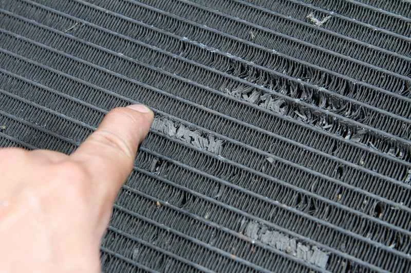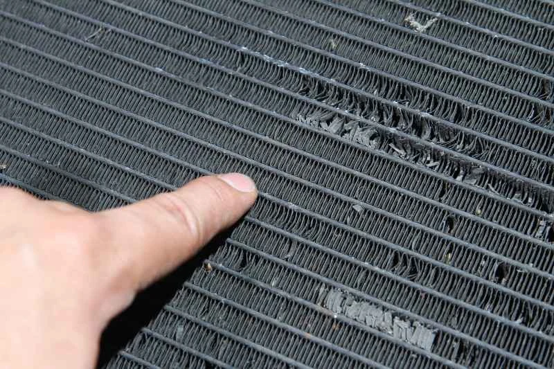 エアコンの必須点検項目の一つ:ラジエーターフィンの状態を確認します。