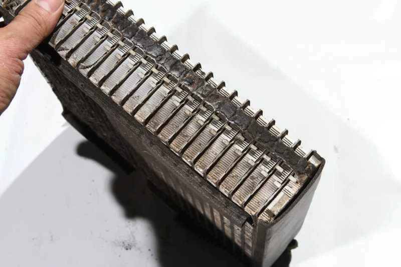 上記の理由に加え、インタビューの中で、一部の車種ではラジエーターの本来の寿命がそれほど長くないことも分かりました。5~6年ほど使用すると、一部の車種ではフィンが脆くなり始めます。特に海辺や工業地帯など、空気中に塩分や酸性ガスが含まれる地域では、この問題はさらに早く進行します。ひどい場合には、写真のように、指で軽く押すだけでフィンが崩れてしまうこともあります。高圧水で洗浄すると、ラジエーターフィン全体が吹き飛ばされ、ラジエーターの放熱能力に深刻な影響を与える可能性があります。それまでにラジエーターを交換しなければ、コンプレッサーも交換しなければなりません。