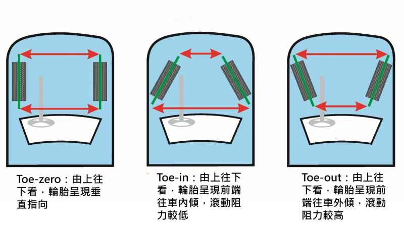 愛車のタイヤが羽毛のように摩耗している場合、タイヤ製造上の問題もいくつかありますが、最も一般的な原因はトーイン/アウトの設定ミスです。トーイン/アウトとは、同一車軸上の2輪の前縁と後縁の幅の差のことです。上から見たときに、前縁の長さが後縁の長さよりも短い場合はトーイン、逆の場合はトーアウトと定義されます。この角度は車両の直進安定性に影響し、台湾では定期車検でもこの値が検査され、「スリッページ値」と呼ばれています。その重要性は想像に難くありません。