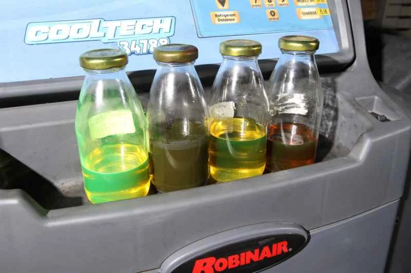 この4本のボトルには、リサイクル・洗浄された冷凍機油が入っています。一部の油は濃い緑色に劣化しており、潤滑効果が著しく低下していることがわかります。このまま使い続けると、コンプレッサーの寿命に間違いなく大きな影響を与えます。冷凍機油を交換した後の第一印象は、コンプレッサーの動作音が格段に静かになり、スロットルが軽くなったことです。カーペットの防水は重要
